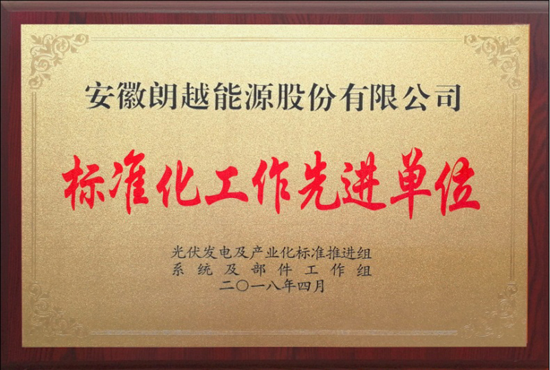 2018年4月,由国家太阳能光伏产品质量监督检验中心(CPVT)主办的“2017~2018年度光伏发电及产业化标准推进组系统及部件工作组年会”上,朗越能源还荣获了系统及部件工作组“标准化工作先进单位”荣誉称号。