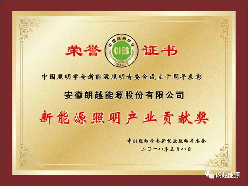 (新能源照明产业贡献奖融荣誉证书)