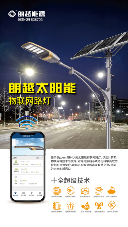 朗越能源基于Zigbee、NB-iot的太阳能物联网路灯,以云计算及物联网等技术为支撑,拥有“十全”超级技术:全球物联控制、全制亮灯模式、全线状态查询、全面自动监测、全年功率调节、全天电池保护、全程安全预警、全新功能拓展、全位微波感应、全心工匠设计,这些前沿先进路灯照明系统的技术使用户通过手机或者电脑终端就可以对路灯的使用情况进行实时了解,实现科学高效的控制和资源整合,并且拥有低温保护专利,即便是处于-50℃的环境下,朗越太阳能物联网路灯仍可以正常工作,成为本溪市高新区华佗产业大道道亮化工程项目的最终选择。