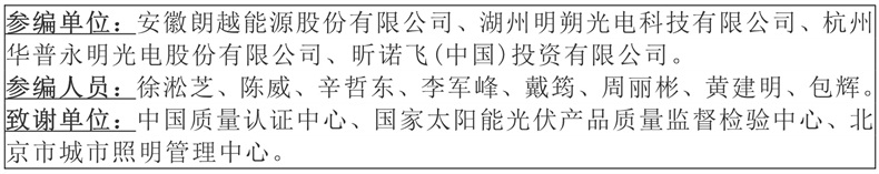 T/CSA 039-2019《锂电池供电的LED太阳能路灯技术规范》主要由安徽朗越能源股份有限公司、东旭光电(股票代码000413)的控股子公司湖州明朔光电科技有限公司、杭州华普永明光电股份有限公司、昕诺飞(中国)投资有限公司共同起草,本标准主要适用于以离网型太阳能光伏独立电源发电以及低压直流方式驱动的锂电池供电LED太阳能路灯,并从路灯的技术要求、试验方法、检测规则、标志、包装、运输、贮存等方面进行了规范。其中对于太阳能电池组件、锂离子电池组以及LED灯具的性能、外观的要求进行了规范并提出了相关测试方法。