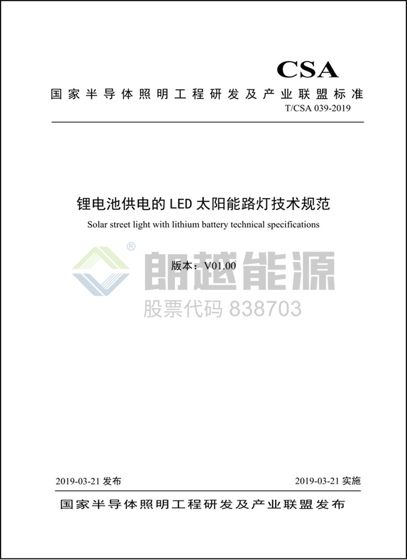 朗越能源牵头起草的T/CSA 039-2019《锂电池供电的LED太阳能路灯技术规范》联盟标准正式发布