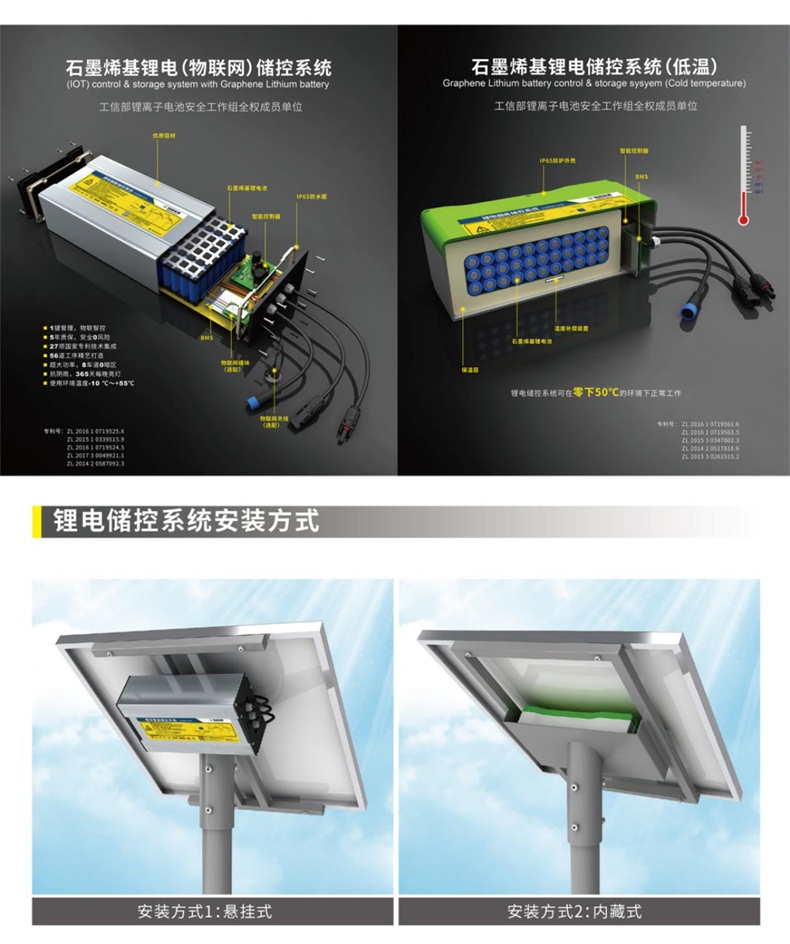 公司自主研发与生产的太阳能路灯专用的“石墨烯基锂离子电芯及锂电物联网储控系统”与国内400多家路灯厂家成功配套;自主研发生产的路霸王、阴雨王、极寒王、赤道王等“锂电物联网太阳能路灯”系列产品覆盖了道路交通照明双向八车道/大功率零暗区、乡村振兴道路亮化等场景;广泛应用于像贵州等地的多雨气候和东北的极寒地带,以及阳光充足、电力紧张的非洲、东南亚地区,业绩遍布国内20多个省份和国外30多个国家和地区。