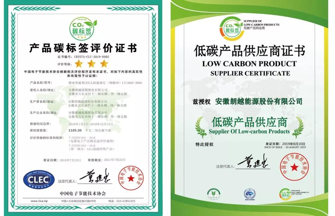 2019年8月10日,第二届电器电子产品碳标签国际会议暨首届粤港澳大湾区产品碳标签国际论坛为安徽朗越能源股份有限公司分别颁发了“产品碳标签评价证书”和“产品碳足迹证书”。为湖州明朔光电科技有限公司、安徽朗越能源股份有限公司颁发了中国“产品碳标签评价证书”和“低碳产品供应商证书”。